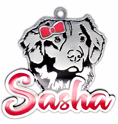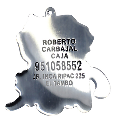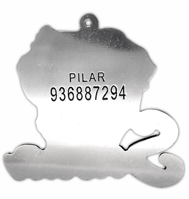 Placa de aluminio ligero y ultra resistente grabada con nombre de la mascota y datos de contacto del dueño.